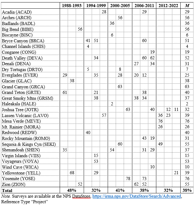 It is possible to estimate how big an audience the Park Service could have reached if 2017-22 climate coverage (35.1%) met the standard set from 2011-16 (49.8%). We can estimate this missing audience with statistical modeling based on visitor use studies. Since 1988, these studies have been conducted independently from NPS by university researchers using valid social scientific survey techniques. 61 such studies have asked visitors if they used park newspapers during their visit. Responses vary from seldom-visited island parks lacking entrance gates (e.g., Channel Islands, 4% of visitors) to global destinations where most visitors reported using the paper (e.g., Yosemite, 76% of visitors). Averaged across these 61 studies, 38% of visitors report using park newspapers (see Appendix A.1).