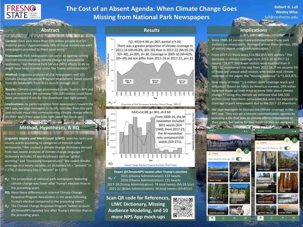 There are more sophisticated and granular ways to estimate the missing audience, but back-of-the-envelope calculations are efficient and appropriate in this research context.[1] We know from official statistics that there were 516,962,055 park visitors from 2017-22 (National Park Service 2023). If, as in 2011-16, 49.8% of 2017-22 newspapers featured climate coverage and 38% of park visitors reported using newspapers, then newspaper climate coverage had a potential audience of 97,829,899 park visitors. However, only 35.1% of 2017-22 newspapers actually featured climate coverage, reducing that potential audience by 29.5% to 68,952,399 and creating a missing audience of 28,877,500. We can then liberally discount the size of that missing audience with a fudge factor; for demonstration purposes, we will assume that only 5% of those who used the newspaper are 1) unique adult visitors who 2) would read climate coverage, reducing the missing audience to 1,443,875.